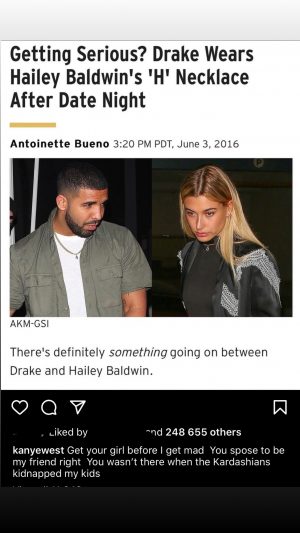 Reperi i njohur Kanye West, së fundmi është kapur me Hailey Bieber por gjithashtu edhe me mikun e tij, Justin Bieber. Ai ka postuar një artikull të vitit 2016, ku Hailey shihej e shoqëruar me Drake dhe madje të dy kishin vendosur varëse të njëjta. Kanye i ka bërë thirrje Justin që të shikojë gruan e tij para se të nevrikoset. “Ti supozohet të jesh shoku im. Ti nuk ke qenë aty kur ‘Kardashians’ rrëmbyen fëmijët e mi”, shkruan Kanye.