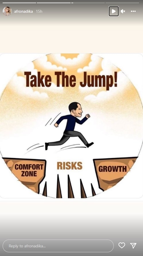 Fotoja tregon një njeri që largohet nga zona e komfortit për tu rritur edhe pse ekspozohet ndaj shumë rreziqeve. “Hidhu”,- shkruhej krah fotos. Ky është parë si një mesazh i drejtpërdrejtë ndaj ish-bashkëshortit të saj Blero.