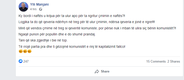 Ish-ministri Ylli Manjani, tashmë edhe aktivist mjaft i angazhuar në media, ka reaguar ditën e sotme në lidhje me çmimet e karburanteve që u vendosën sot nga bordi.