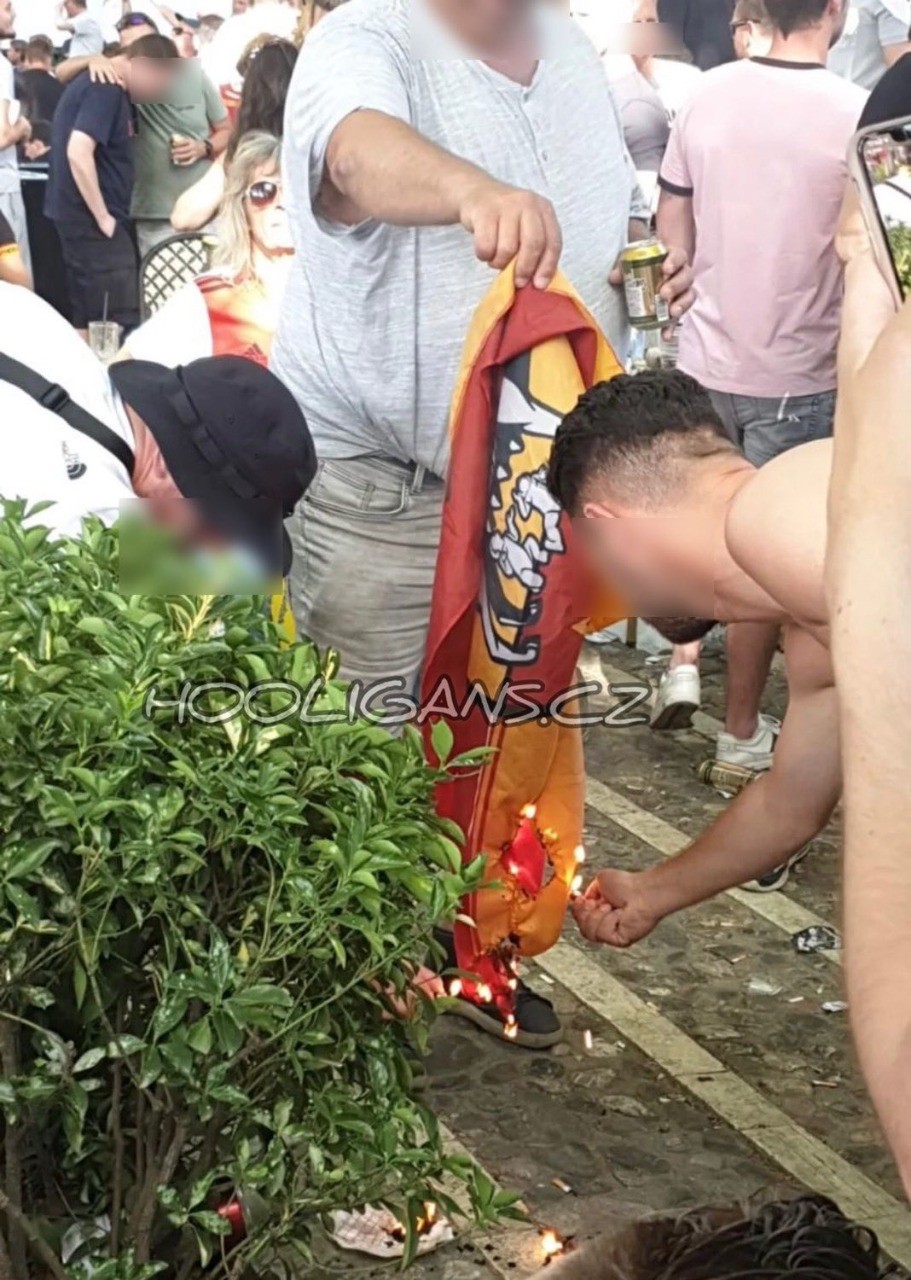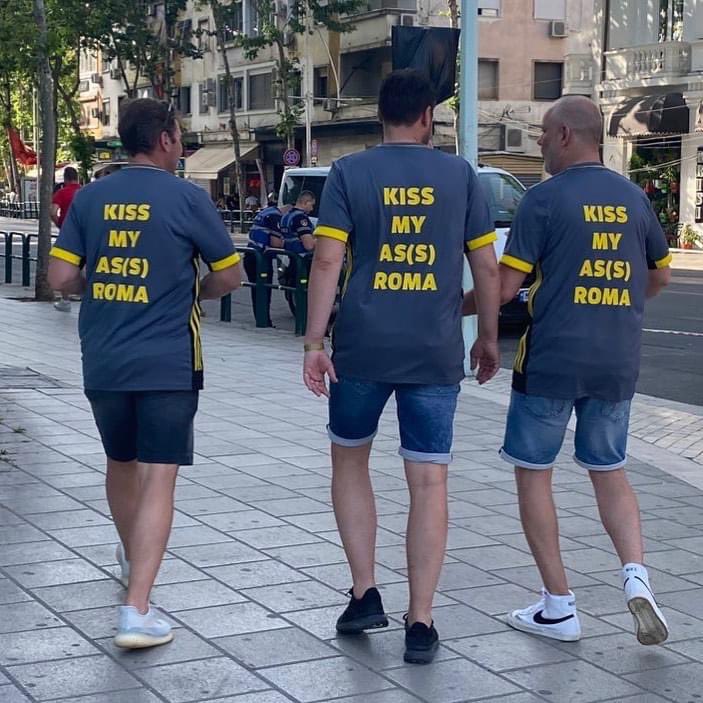 Pasi urinuan ditën e djeshme në autobusin e klubit roman, sot ata janë shfaqur duke ecur rrugëve të Tiranës me bluza me mbishkrim “Kiss my Ass Roma”.