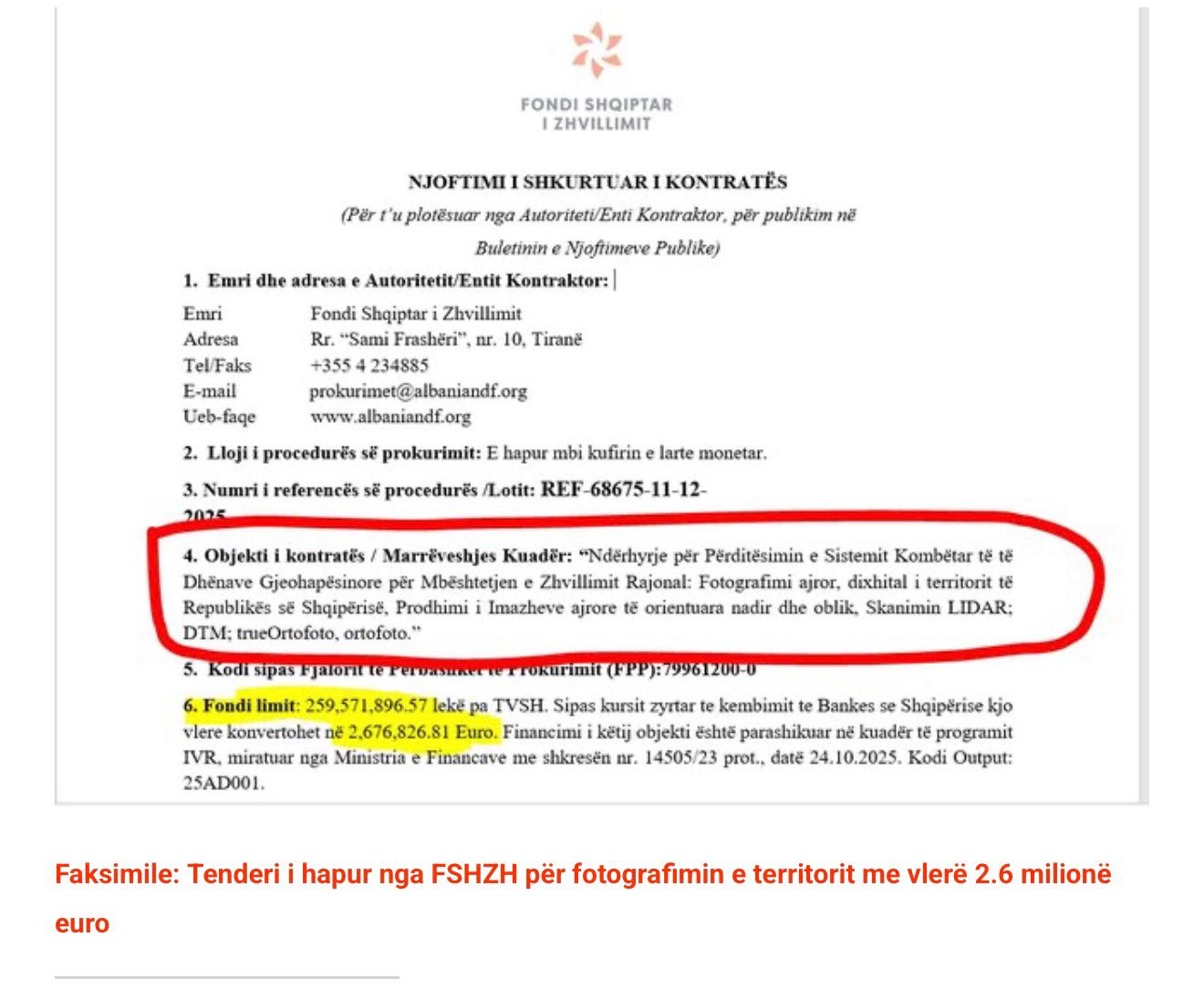 Sipas dokumenteve që ka hulumtuar VoxNews, Fondi Shqiptar i Zhvillimit ka hapur një tender ditët e fundit me objekt “fotografimi ajror, dixhital i territorit të Republikës së Shqipërisë”. Sipas saj, kërkohet të prodhohen imazhe ajrore të orientuara. Fondi limit është rreth 2.6 milionë euro pa TVSH.