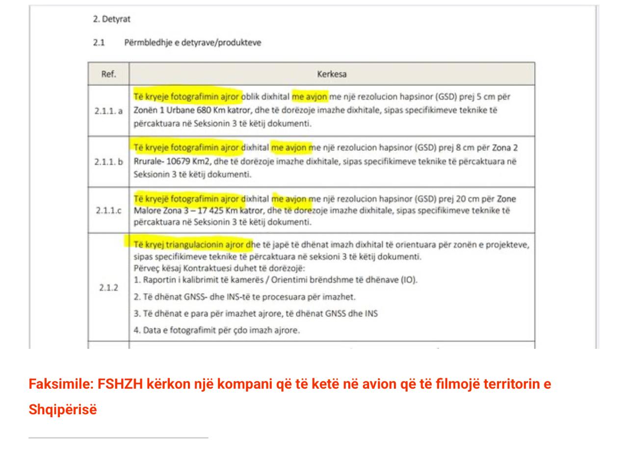 Por, me çfarë do të bëhen fotot? Sipas dokumenteve, FSHZH ka kaluar nga satelitët e famshëm që nuk vlejtën te avionët. Janë avionë specifikë që filmojnë territorin nga lartësia dhe prodhojnë fotografi të të gjithë zonës. Të njëjtë si avionët që kontrollonin Shqipërinë për drogë.