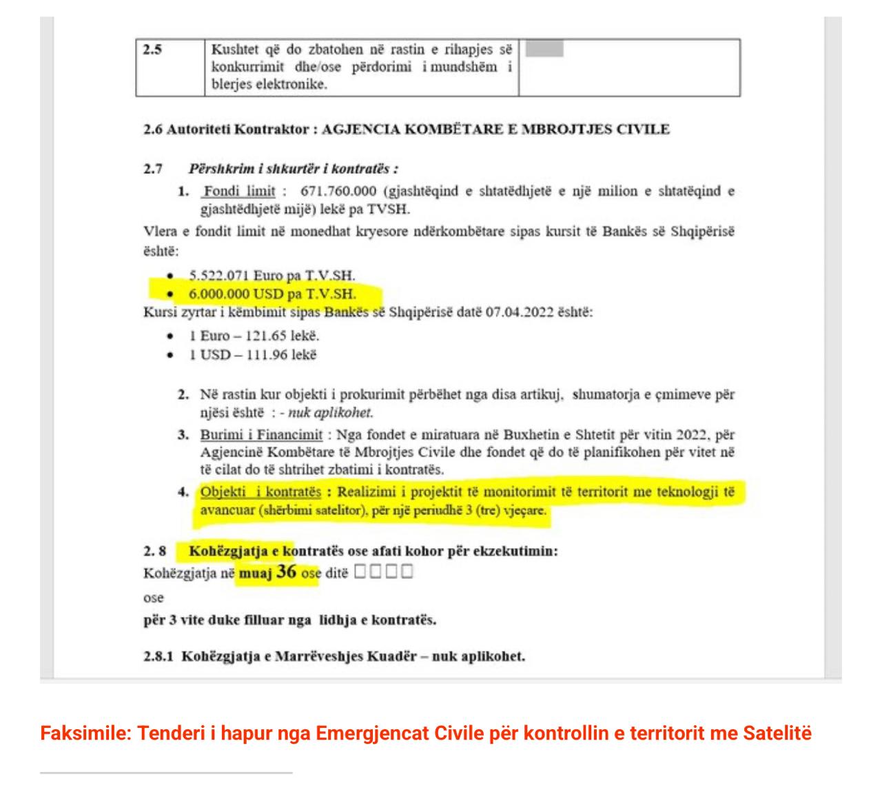 Por, a nuk u filmua territori me satelitët e famshëm? Në fund të vitit 202, Agjencia Kombëtare e Mbrojtjes Civile hapi tenderin me objekt “realizimi i projektit të monitorimit të territorit me teknologji të avancuar (shërbimi satelitor)”, për një periudhë 3 vjeçare. Fondi limit ishte 671.760.000 lekë pa TVSH.