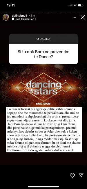 “Po tani ai format si anglez që është, është shumë i shpejtë dhe me minutazhe të përcaktuara dhe nuk të jep mundësi të shpalosësh gjithë artin si prezantuese sepse vëmendje aty marrin konkurentët dhe juria. Tani Bora ka diçka shumë të mirë që ja kam thënë personalisht, që nuk ka protagonizëm, pra nuk ndërhyn kot thjesht sa për të folur dhe nuk e kthen show-n tek vetja. Edhe kur u bë protagoniste në media, u bë nga një histori, jo nga moderimi i saj. Kështu që është shumë ok për këtë format. Ju që doni më shumë minuta prej saj, prisni se rrugës do ulet numri i konkurentëve e do zgjatet koha e diskutimeve”- shkruan Dalina.