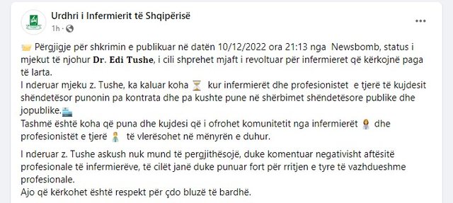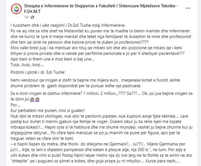 Pas deklaratës së mjekut pediatër Edi Tushe ku në një postim në rrjetet sociale, mjeku ka qenë i ashpër ndaj infermierëve në Shqipëri që sipas tij kërkojnë paga të larta, por nuk dinë as fjalët teknike të profesionit të tyre apo si të marrin gjak.