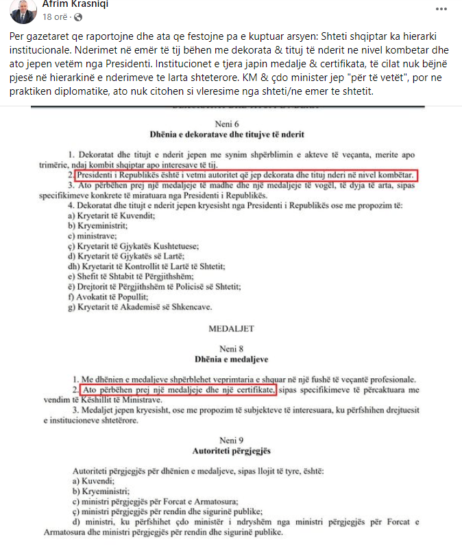 Përmes një postimi në rrjete sociale, Krasniqi shkruan se nderimet dhe dekoratat duhet të jepen vetëm nga Presidenti dhe askush tjetër. Sakaq shton se titujt e nderit që jepen nga kryeministri dhe ministrat nuk citohen si vlerësime nga shteti apo në emër të këtij të fundit.