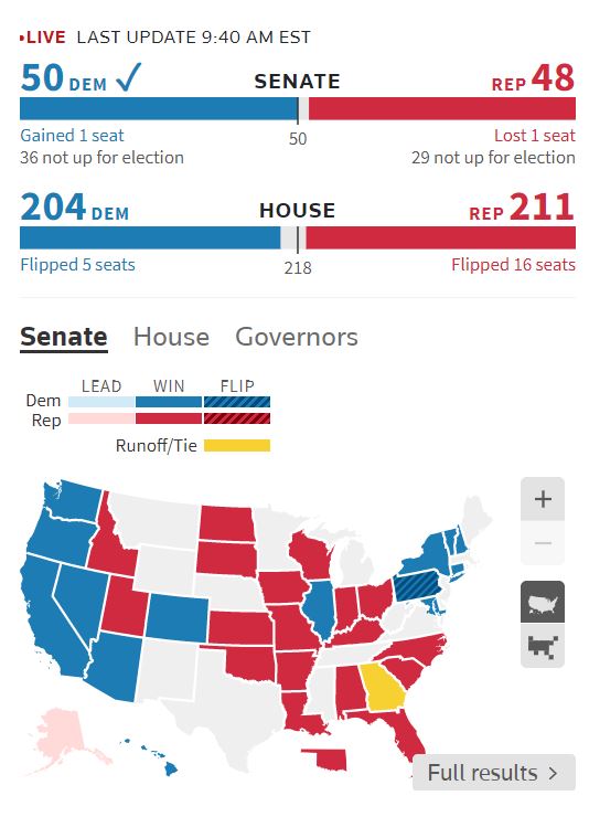 Mund të duhen disa ditë përpara se të mësohet rezultat i qartë i garës në Dhomën e Përfaqësuesve për të përcaktuar se cila parti do të kontrollojë dhomën me 435 vende. Të shtunën vonë, republikanët kishin fituar 211 vende, nga 218 që janë të nevojshme për të fituar shumicën, ndërsa demokratët kishin 205.