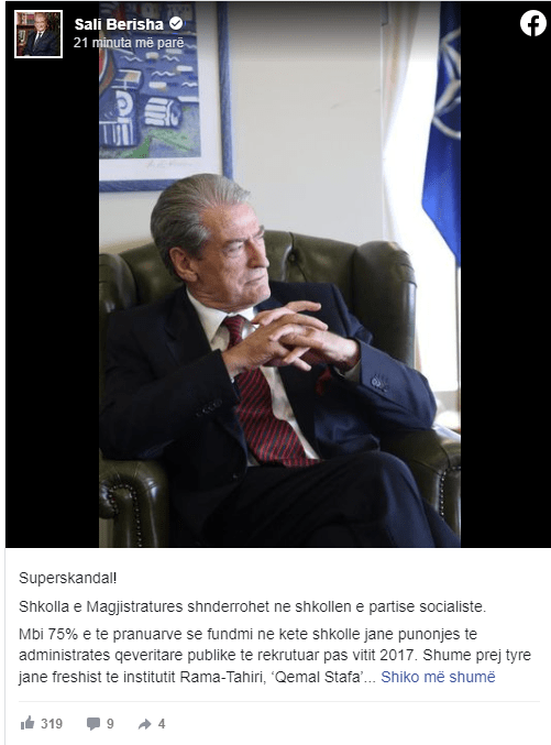 “Mbi 75% e të pranuarve së fundmi në ketë shkollë janë punonjës të administratës qeveritare publike të rekrutuar pas vitit 2017. Shumë prej tyre janë freshist të institutit Rama-Tahiri, ‘Qemal Stafa”, shkruan Berisha.