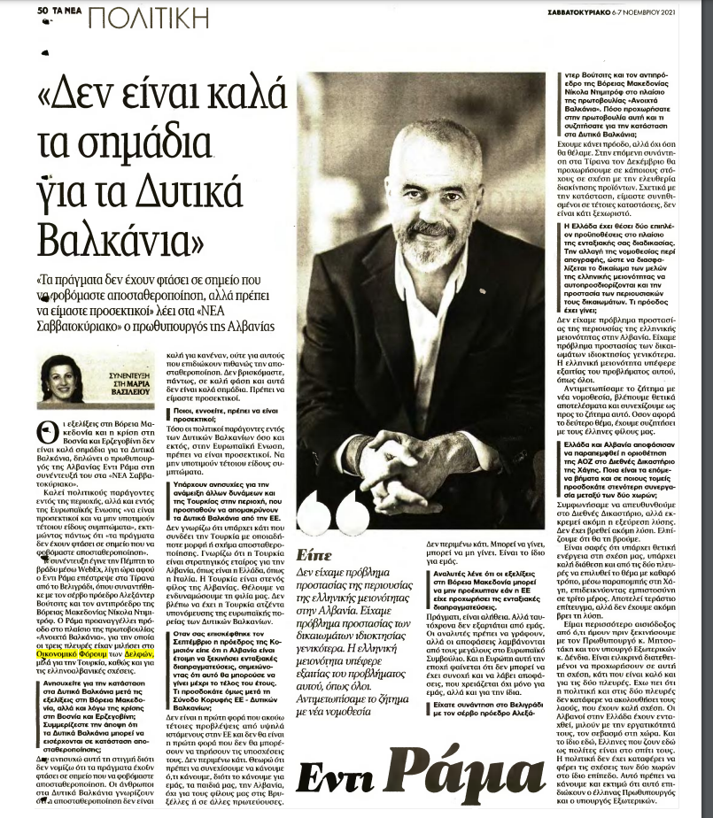 Nuk kemi pasur problemin e mbrojtjes së pronës së minoritetit grek në Shqipëri. Kemi pasur problem me mbrojtjen e të drejtave të pronësisë në përgjithësi. Minoriteti grek vuajti për shkak të këtij problemi, sikundërse gjithë të tjerët. Ne e kemi trajtuar këtë çështje përmes një legjislacioni të ri …. nuk pres diçka. Mund të realizohet, mund të mos realizohet. Është e njëjta gjë për ne. Analistët thonë se zhvillimet në Maqedoninë e Veriut mund të mos kishin ndodhur nëse BE-ja do të kishte vazhduar me negociatat e anëtarësimit. Po, është e vërtetë, por në të njëjtën kohë nuk varet nga ne. Analistët duhet të shkruajnë, por vendimet i marrin të mëdhenjtë në Këshillin e Evropës. Evropa në këtë kohë duket se nuk mund të ketë kohezion dhe të marrë vendimet që i nevojiten, jo vetëm për ne, por edhe për veten e saj.