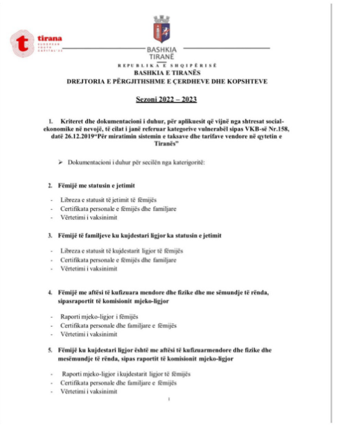 Në njoftimin zyrtar hkruhet se në datat 13–24 qershor 2022, ora 09:00–14:00, në çdo kopsht publik të Bashkisë Tiranë, do të kryhet procedura e aplikimit për regjistrimin e fëmijëve në kopsht.