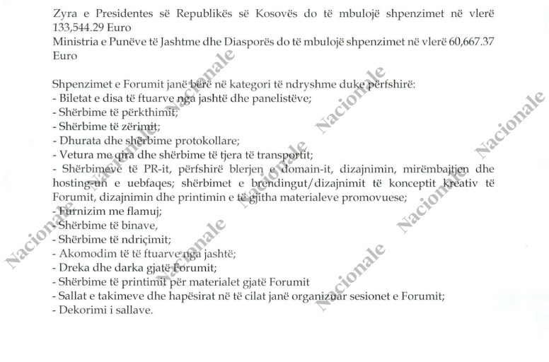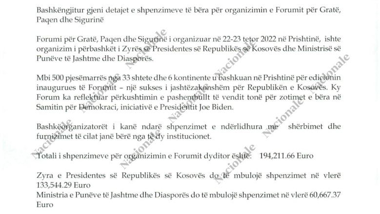 Gazeta Nacionale përmes kërkesës për qasje në dokumente zyrtare, nga Zyra e Presidentes ka konfirmuar se Forumi për Gratë, Paqen dhe Sigurinë, ka kushtuar plot 194 mijë e 211 euro.