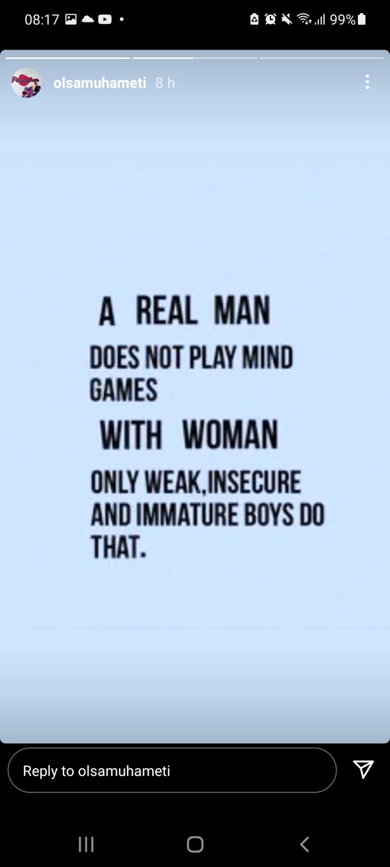 Kur Donaldi shprehu brenda BBV se Beatrix është “ajo që dua”, Olsa reagoi menjëherë në mbështetje të Bora Zemanit. Megjithatë, ajo nuk la pa ironizuar dhe thumbuar Donaldin. Në një postim në ‘Instastory’ ajo shkruante: “Vetëm meshkujt e fortë nuk luajnë lojëra me femrat, meshkujt e dobët dhe të pasigurt e bëjnë këtë.”