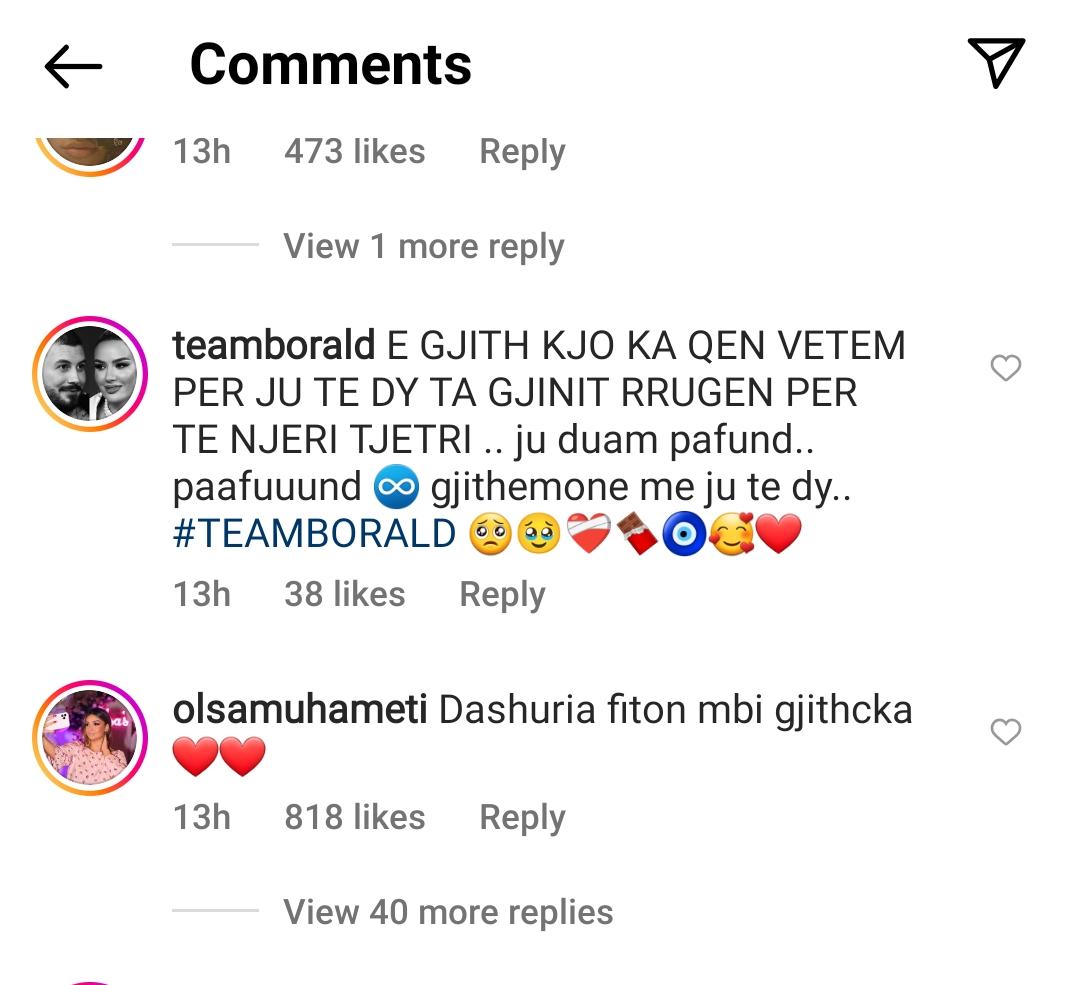 Mes tyre vihet re komenti i autores së “Për’puthen”, Olsa Muhameti, e cila ka një raport mjaft të mirë me Bora Zemanin. Disa muaj më parë kur Donaldi nisi një lidhje me Beatrix Ramosajn brenda BBV, Olsa e thumboi hapur aktorin. Por së fundmi duket se ajo është e lumtur për ribashikimin e tij me Borën. Të paktën kështu ka lënë ajo të kuptohet me komentin e saj në foton e Borës. “Dashuria fiton mbi gjithçka”, shkruan Olsa.