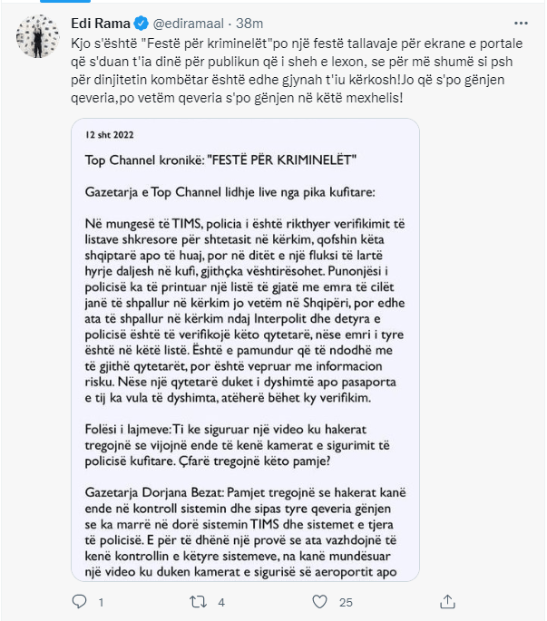 Përmes një postimi në ‘Twitter’, Rama shkruan se media është duke e kthyer informacionin në një festë për kriminelët, ku thekson se ekranet e portalet nuk duan t’ja dinë për se çfarë lexon publiku.