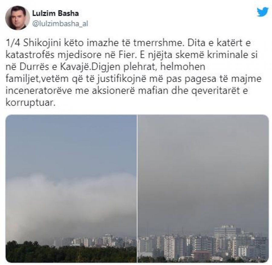 Kreu i Partisë Demokratike Lulzim Basha e ka nisur ditën duke publikuar disa imazhe nga ajo që e konsideron si katastrofa mjedisore në Fier, të shkaktuar nga djegia e mbeturinave në këtë qytet.