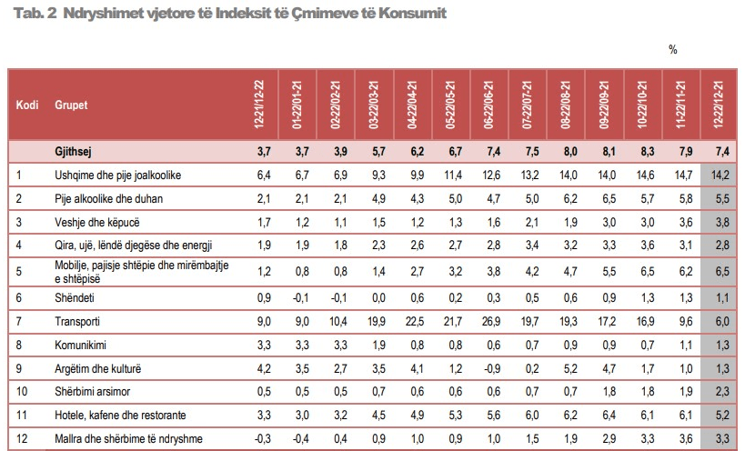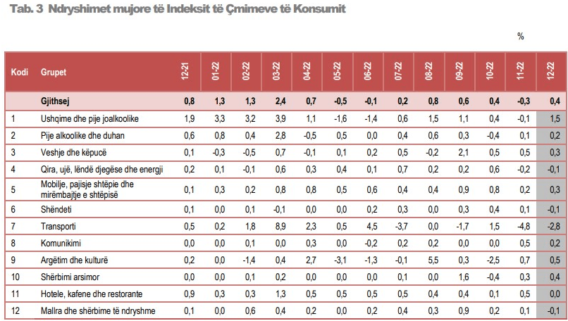 Rritja mesatare vjetore e çmimeve në vitin 2022 është 6,7% nga 2,0% që ishte në vitin 2021.Krahasuar me muajin Dhjetor 2021, rritja më e madhe e çmimeve vërehet në grupin “Ushqime dhe pije joalkoolike” me 14,2%, pasuar nga grupet “Mobilje, pajisje shtëpie dhe mirëmbajtje e shtëpisë” me 6,5%, “Transporti” me 6,0%, “Pije alkoolike dhe duhan” me 5,5%, “Hotele, kafene dhe restorante” me 5,2%, “Veshje dhe këpucë” me 3,8%, “Mallra dhe shërbime të ndryshme” me 3,3%, “Qira, ujë, lëndë djegëse dhe energji” me 2,8%, “Shërbimi arsimor” me 2,3%, “Komunikimi” dhe “Argëtim dhe kulturë” me 1,3% secili dhe “Shëndeti” me 1,1%.
