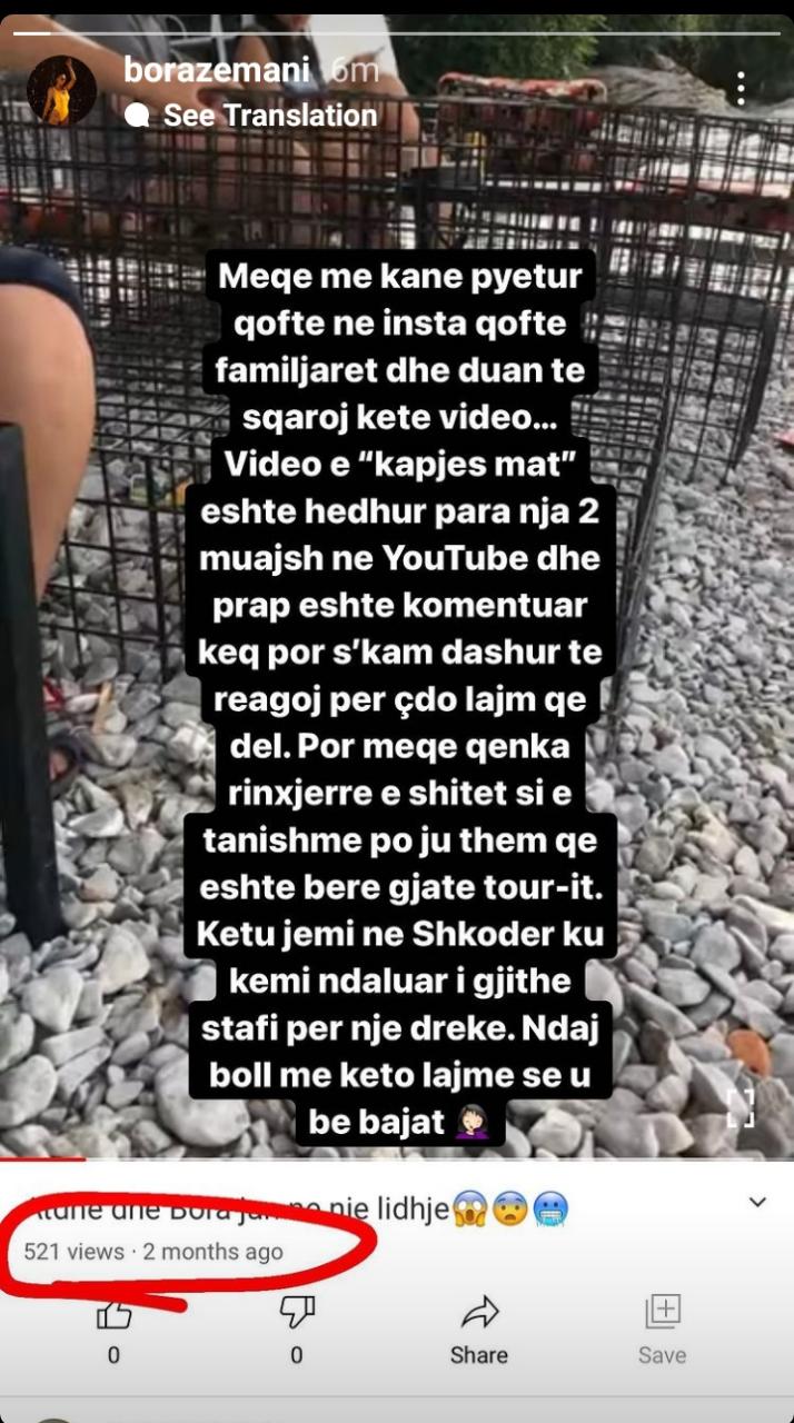’Meqë më kanë pyetur qoftë në insta qoftë familjarët dhe duan ta sqaroj këtë video.. Video e ‘’kapjes mat’’ është hedhur para 2 muajsh në Youtube dhe prap është komentuar keq por s’kam dashur të reagoj për çdo lajm që del. Por meqë qenka rinxjerrë e shitet si e tanishme po ju them që është bërë gjatë tour-it. Këtu jemi në Shkodër ku kemi ndaluar i gjithë stafi për një drekë. Ndaj boll me këto lajme se u bë bajat’’, ka shkruar Bora.