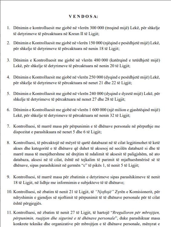 Në vendimin e publikuar në muajin Nëntor të vitit 2022 komisioneri për mbrojtjen e të dhënave personale ka konstatuar 6 shkelje ligjore nga tatimet për të cilat janë vendosur edhe masat administrative.