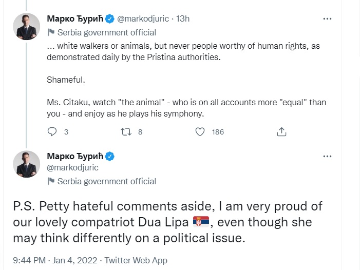 “Duke lënë komentet e urrejtjes anash, jam shumë krenar për bashkëkombësen tonë të dashur Dua Lipa (vendos edhe flamurin e Serbisë) edhe pse ajo mund të mendojë ndryshe për çështjet politike”, shkruan Gjuriç gjatë një replike me ish-ambasadoren e Kosovës në Shtetet e Bashkuara të Amerikës, Vlora Çitaku.