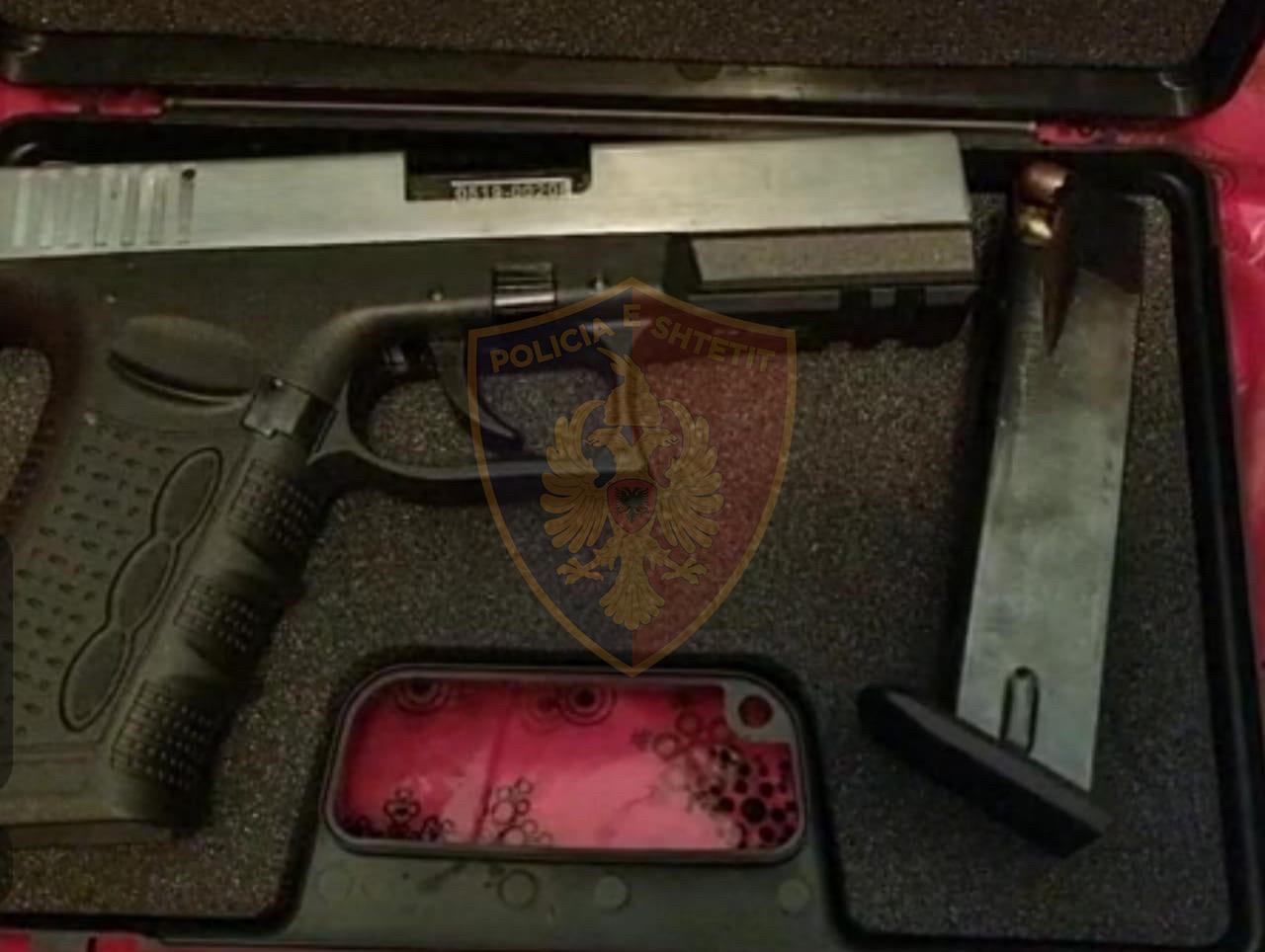 Gjatë kontrollit në banesë, shërbimet e Policisë gjetën dhe sekuestruan në cilësinë e provës materiale një armë zjarri pistoletë tip “Glock” dhe një sasi fishekësh.