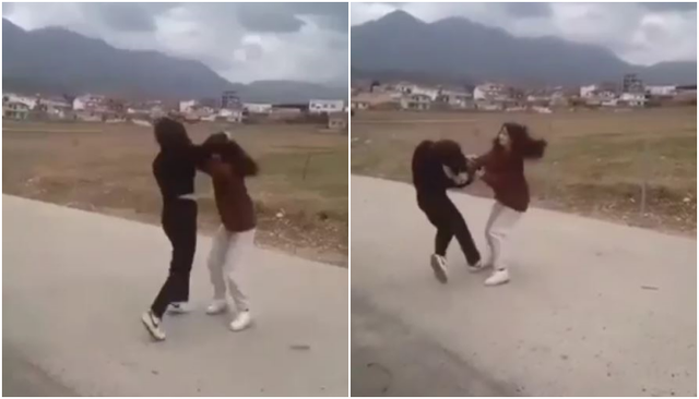 Në video shihet se dy vajzat nuk janë vetëm, pasi teksa ato po zihen, ‘shfaqja’ shihet edhe nga bashkëmoshatarët e tyre.