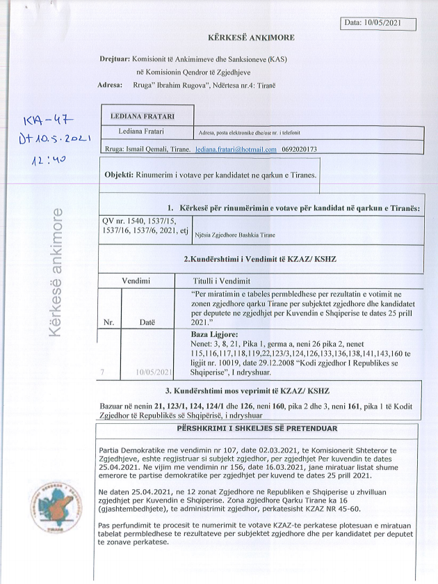 Fratari i është drejtuar Komisionit të Ankimimeve dhe Sanksioneve me një kërkesë lidhur me parregullsitë e caktuara në procesin e numërimit të votave për kandidatët e partive politike.
