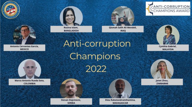 Për të demonstruar angazhimin tonë të vazhdueshëm ndaj kësaj çështjeje, Sekretari i Shtetit Antony J. Blinken lançoi Çmimin Ndërkombëtar të Kampionëve Anti-Korrupsion në 2021 për të vlerësuar individët që kanë demonstruar lidership, guxim dhe ndikim në parandalimin, ekspozimin dhe luftimin e korrupsionit. Ky çmim demonstron mbështetjen tonë për liderët dhe novatorët antikorrupsion. Këtë vit, të nderuarit tanë patën mundësinë të merrnin pjesë në një Program dy-javor të Udhëheqjes së Vizitorëve Ndërkombëtar (IVLP) për t’u angazhuar me homologët amerikanë të angazhuar për të luftuar korrupsionin. Shpresojmë që ju të bashkoheni me ne në festimin e këtyre kampionëve dhe në njohjen e të gjithë atyre që luftojnë për llogaridhënie, transparencë, sundim të ligjit dhe lirinë e shtypit.