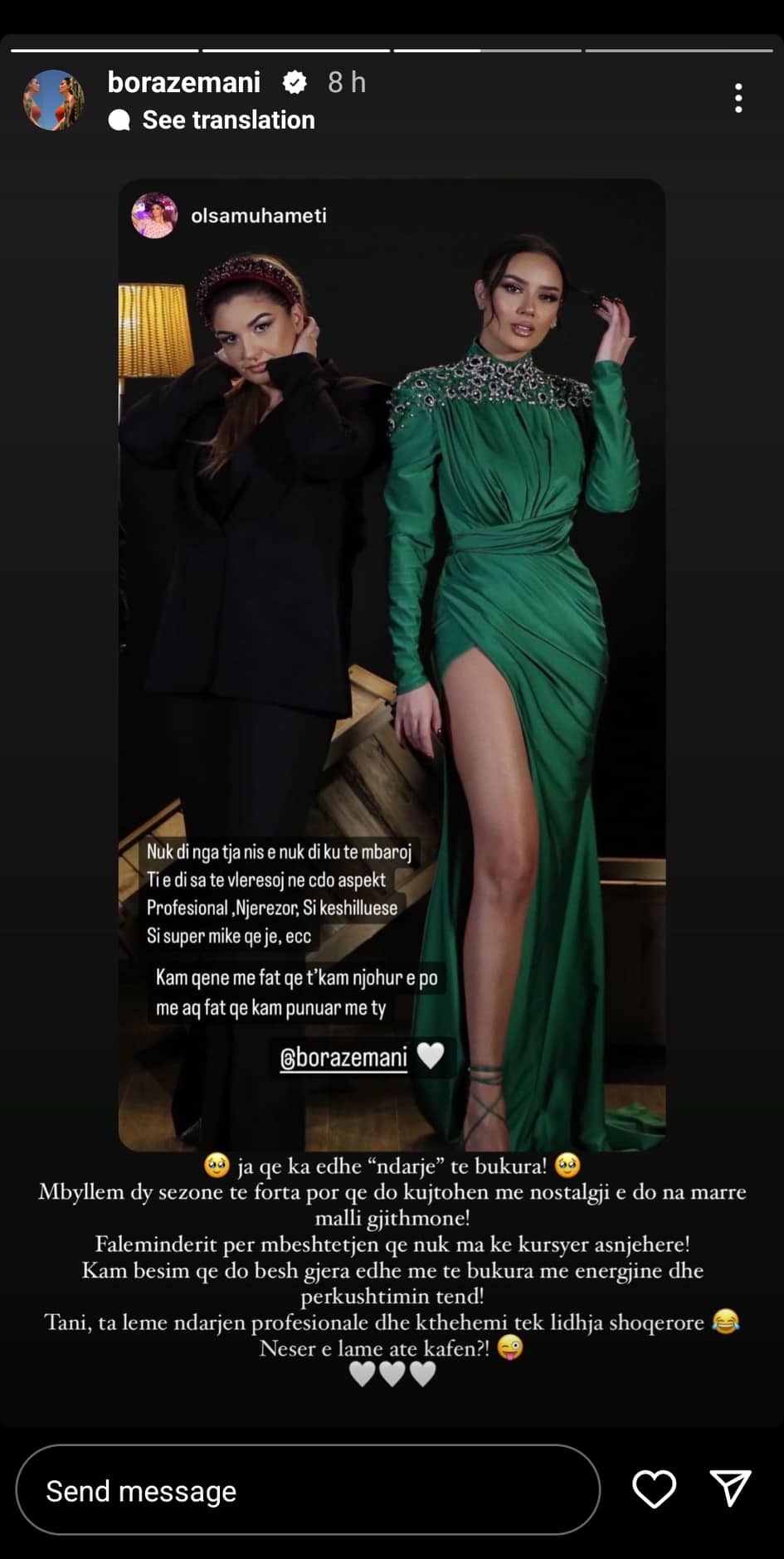 Kjo duket ta ketë emocionuar Borën. Mes “emoji” me lot në sy, prezantuesja e njohur është shprehur: “Ja që ka edhe ‘ndarje’ të bukura. Mbyllëm dy sezone të forta por që do kujtohen me nostalgji e që do na marrë malli gjithmonë. Faleminderit për mbështjetjen që nuk ma ke kursyer asnjëherë. Kam besim që do bësh gjëra edhe më të bukura me energjinë dhe përkushtimin tënd. Tani ta lëmë ndarjen profesionale dhe të kthehemi tek lidhja shoqërore. Nesër e lamë atë kafen? Të dua shumë Olsa”.