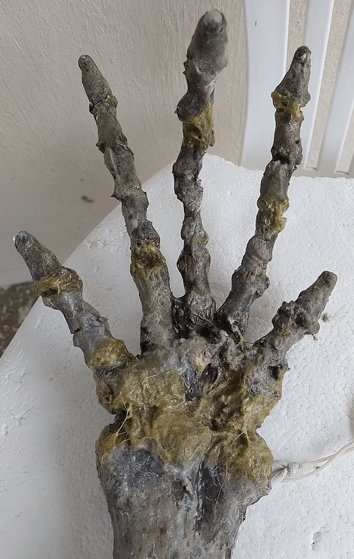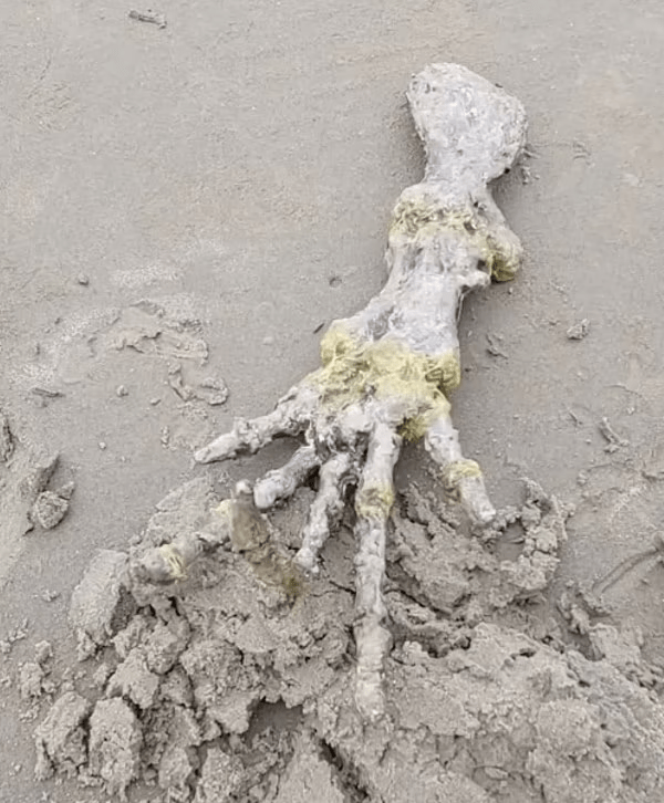 Një skelet që u gjend në breg në një plazhi në Brazil këtë javë ngjalli frikë tek një çift që thanë se duket si dora e një alieni. Leticia Gomes Santiago dhe i dashuri i saj, Devanir Souza, po shëtisnin përgjatë vijës bregdetare ku panë një dorë gjigante me gishta të gjatë kockor.