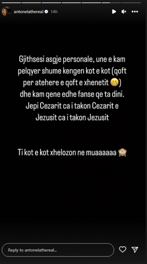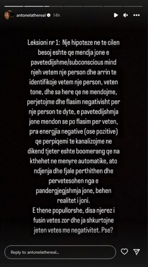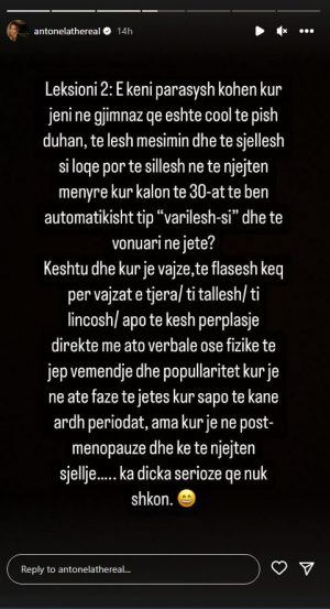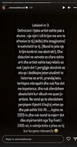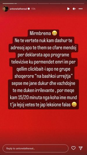 Në lidhje me këtë deklaratë, së fundmi ka reaguar edhe ish-konkurrentja e “Për’puthen”. Me anë të disa shkrimeve në Instastory, Antonela u shpreh se nuk ka dashur të komentojë deklaratat ku përmendet emri i saj, por që sipas saj kishte pak minuta kohë dhe mund t’ia lejonte vetes të jepte disa leksione falas.