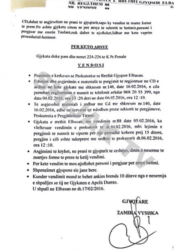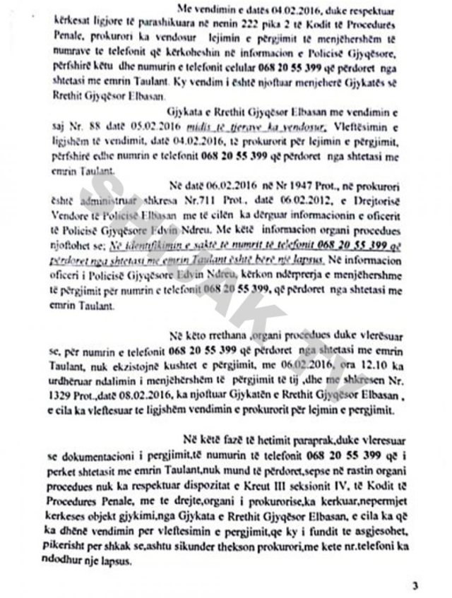“Fshirjen dhe asgjësimin e materialit të përgjimit të regjistruar në CD e ardhur në këtë gjykatë me shkresën nr. 140 datë 16/02/2016, e cila përmban regjistrimin e numrit të telefonit celular 0682055399 nga data 04/02/2016 ora 13:20 minuta deri në datën 06/02/2016 në orën 12:10 minuta”, thuhet në vendimin e gjykatës, sërish për numrin e përdorur nga “Njeriu Taulant”.