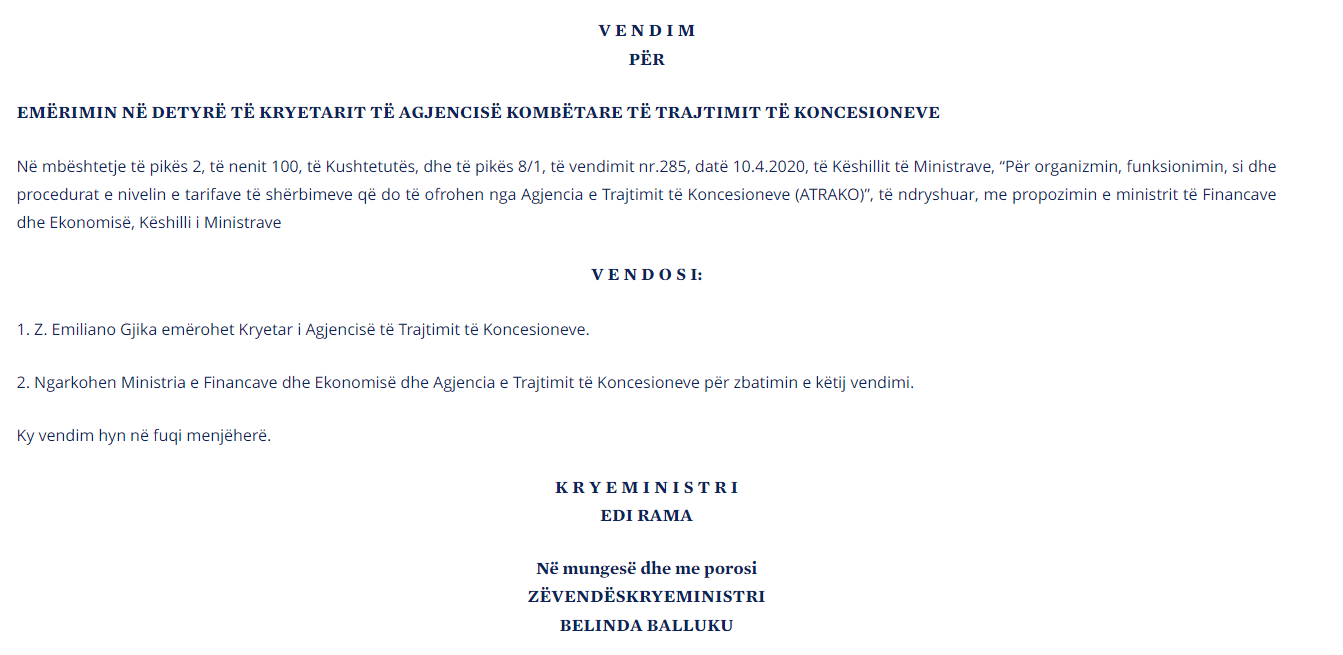 Këshilli i Ministrave ka caktuar këtë të mërkurë kryetarin e ri të Agjencisë së Trajtimit të Koncesioneve.