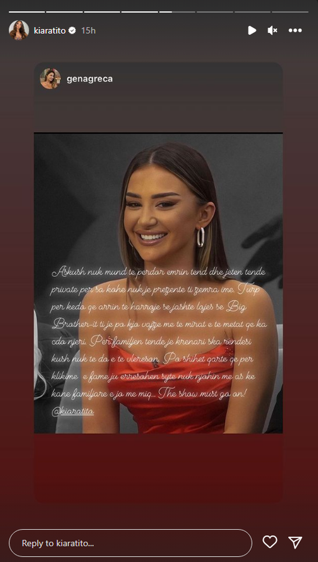 Së fundmi, tezja e Kiarës, Gena, ka reaguar nëpërmjet një postimi në ‘InstaStory’ e cila shkruan se askush nuk mund të përdorë emrin dhe jetën private të Kiarës, përsa kohë ajo nuk është prezente.
