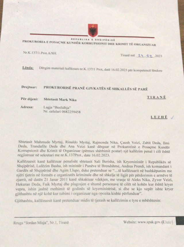 “Për këtë arsye, referuar nenit 75/a, 76 dhe 28 te K.Pr.Penale ju përcjellim për kompetencë lëndore materialin kallëzues me nr. K.137 prot., date 16.02.2023, me qëllim vlerësimi nga ana juaj. Nëse në vijim të verifikimeve apo hetimeve, do të konstatohet ekzistenca e ndonjë vepre penale apo subjekt në kompetencë hetimi sipas nenit 75/a të Kodit të Procedurës Penale, atëherë aktet e procedimit penal të dërgohen për kompetencë lëndore në Prokurorinë e Posaçme Kundër Korrupsionit dhe Krimit të Organizuar, referuar dhe nenit 28 të Kodit të Procedurës Penale”, thuhet në përfundim të letrës së Altin Dumanit.