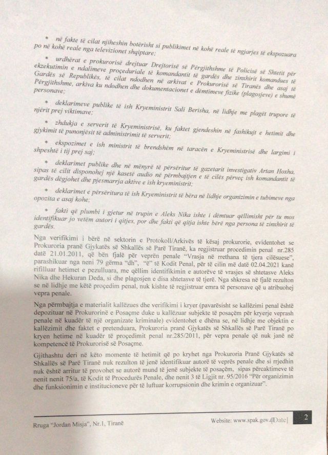 Në letrën që mban datën 24 shkurt, Dumani ka deklaruar se SPAK është një pritje se çfarë do të dalë nga hetimet e Prokurorisë së Tiranës. Ai thekson se në rast se nga hetimet do të konstatohet ekzistenca e ndonjë vepre penale apo subjekt në kompetencë hetimi, atëherë dosja do të merret në dorë nga vetë SPAK, siç ata kërkojnë.