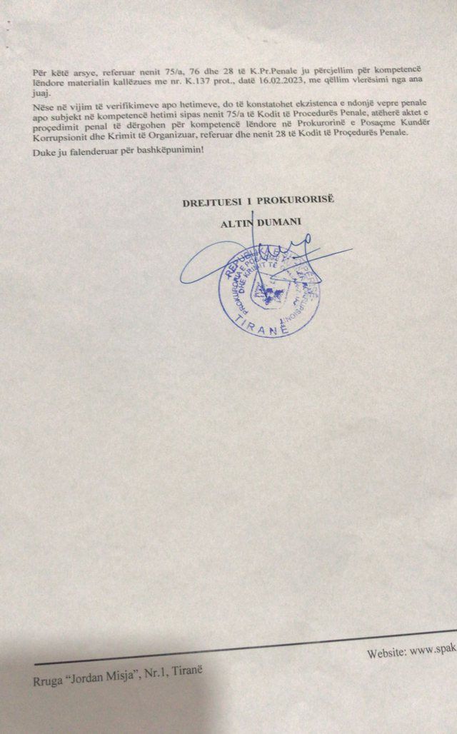 “Për këtë arsye, referuar nenit 75/a, 76 dhe 28 te K.Pr.Penale ju përcjellim për kompetencë lëndore materialin kallëzues me nr. K.137 prot., date 16.02.2023, me qëllim vlerësimi nga ana juaj. Nëse në vijim të verifikimeve apo hetimeve, do të konstatohet ekzistenca e ndonjë vepre penale apo subjekt në kompetencë hetimi sipas nenit 75/a të Kodit të Procedurës Penale, atëherë aktet e procedimit penal të dërgohen për kompetencë lëndore në Prokurorinë e Posaçme Kundër Korrupsionit dhe Krimit të Organizuar, referuar dhe nenit 28 të Kodit të Procedurës Penale”, thuhet në përfundim të letrës së Altin Dumanit.