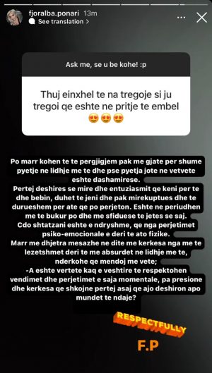 Marr me dhjetëra mesazhe në ditë me kërkesa nga më të lezeçmet deri tek më absurdet në lidhje me të. Ndërkohë mendoj me vete: A është vërtetë kaq e vështirë të respektohen vendimet dhe përjetimet e saj emocionale, pa presione dhe kërkesa që shkojnë përtej asaj që ajo dëshiron apo mundet të ndajë?”-shkroi Fjoralba Ponari.