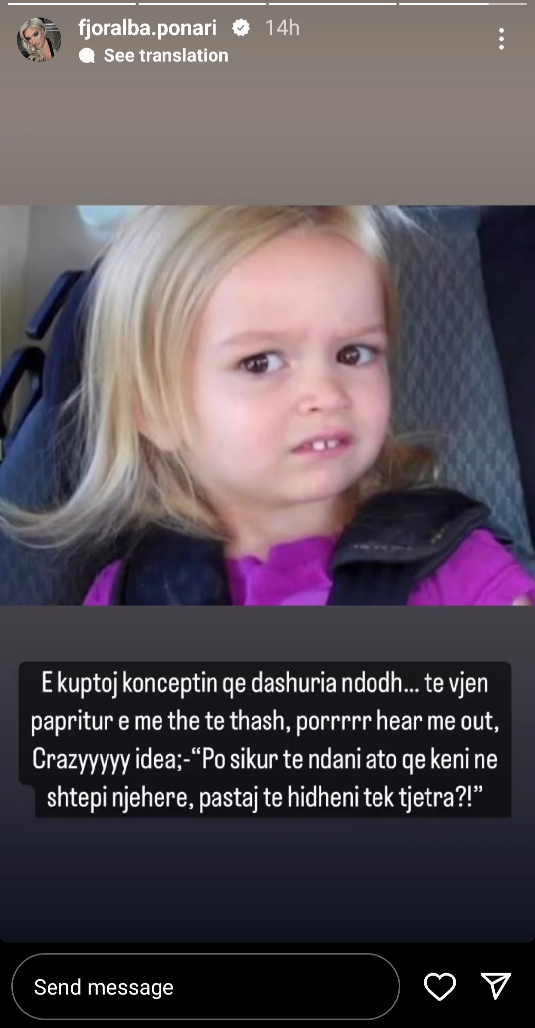 “E kuptoj konceptin që dashuria ndodh… të vjen papritur e më the të thashë, por më dëgjo, Ide e çmendur: Po sikur të ndani ato që keni në shtëpi njëherë, pastaj të hidheni tek tjetra?!”,- shkruan Fjoralba.