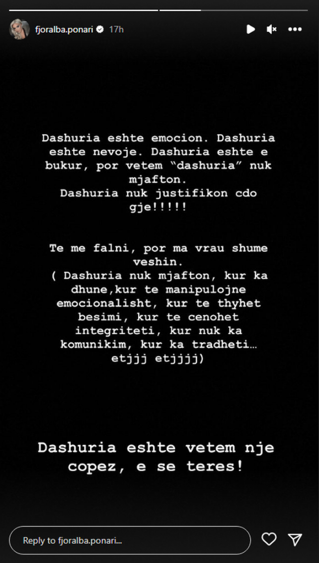 “Dashuria është emocion. Dashuria është nevojë. Dashuria është e bukur, por vetëm “dashuria” nuk mjafton. Dashuria nuk justifikon çdo gjë! Të më falni, por ma vrau shumë veshin. Dashuria nuk mjafton, kur ka dhunë, kur të manipulojnë emocionalisht, kur të thyhet besimi, kur të cënohet integriteti, kur nuk ka komunikim, kur ka tradhëti etj. Dashuria është vetëm një copëz, e së tërës!” shkruan Fjoralba në InstaStory.