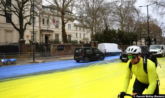 Një grup aktivistësh kanë hedhur qindra litra ngjyrë të verdhë dhe të kaltër në rrugën ku gjendet ndërtesa e Ambasadës ruse në Londër, duke krijuar një flamur gjigant ukrainas, një ditë para përvjetorit të parë të pushtimit rus të Ukrainës.