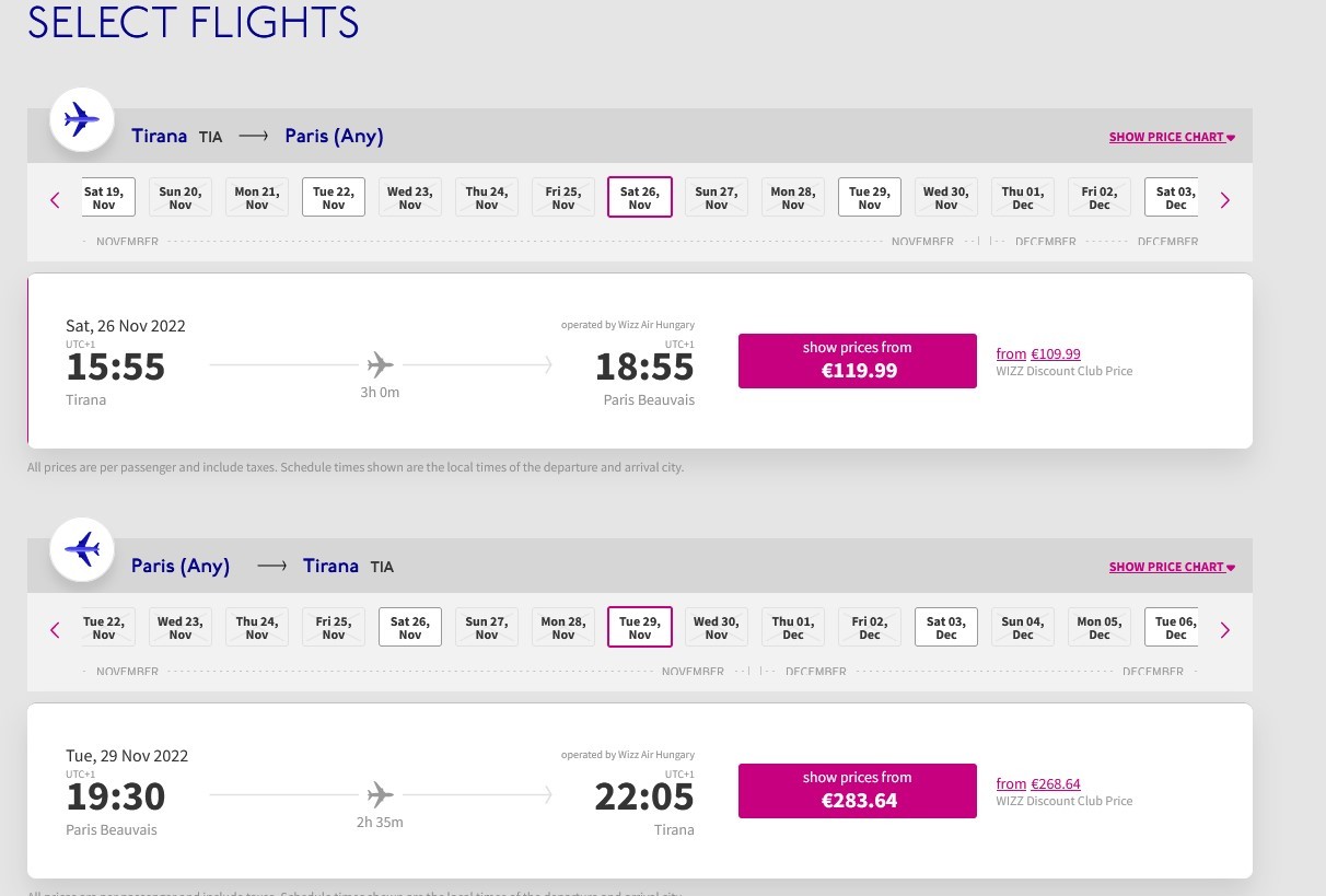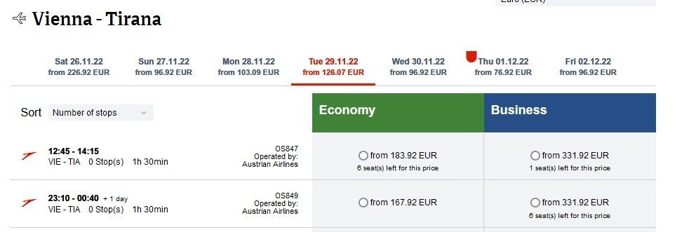 Për në Vjenë, me Wizz Air, në datën 25, bileta për vajtje është 260 euro dhe kthimi në 28 nëntor është 80 euro. Me Austrian Airlines, në 26 nëntor, bileta më e lirë për vajtje është 223 euro, ndërsa kthimi në 29 nëntor më i liri është 168 euro.
