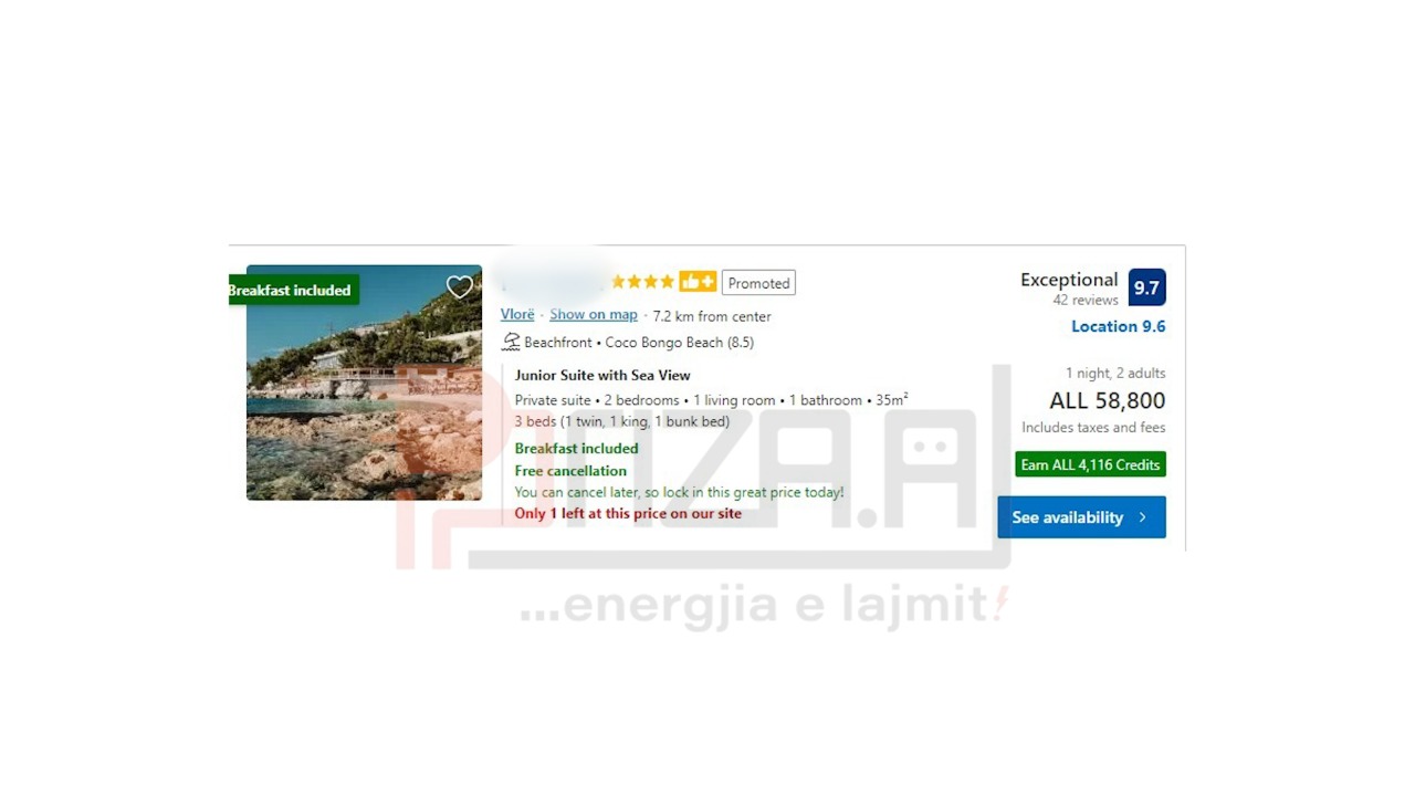 Le të rikthehemi te kostot e akomodimit. Sipas një vëzhgimi të kryer nga gazetarë të Priza.al, rezulton se vetëm në një natë ju duhet të paguani 58.800 lekë. Këtu flasim për një hotel me tri krevate, me një largësi prej 7.2 km nga qendra.