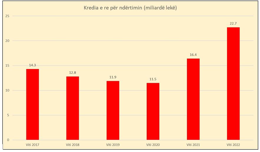 Kredia për sektorin e ndërtimit këtë vit po shënon nivelet më të larta në të paktën gjashtë vitet e fundit. Sipas të dhënave nga Banka e Shqipërisë, për 7-mujorin 2022, kredia e re për ndërtimin kishte vlerën e 22.7 miliardë lekëve ose 194 milionë eurove.