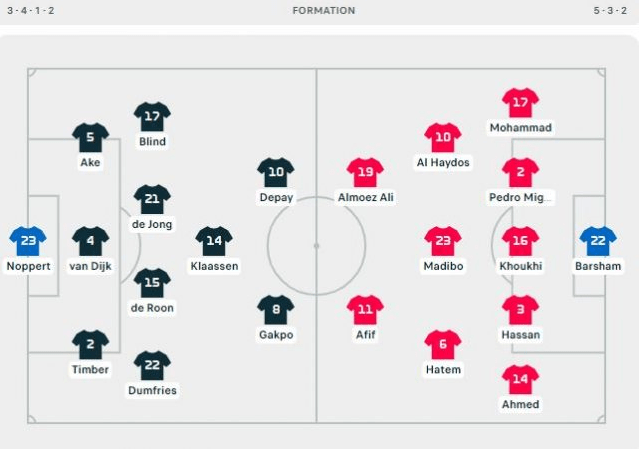 Tekniku Luis Van Gaal ka zgjedhur formacionin 3-5-2, ku në portë vazhdon të ketë besim të palëkundur të Noppert, mbrojtja përbëhet nga Timber, Van Dijk dhe Ake. Në mesfushë vendosen Dumfries, De Roon, De Jong, Blind dhe Klaassen, ndërsa sulmi do të përbëhet nga Depay dhe Gakpo.