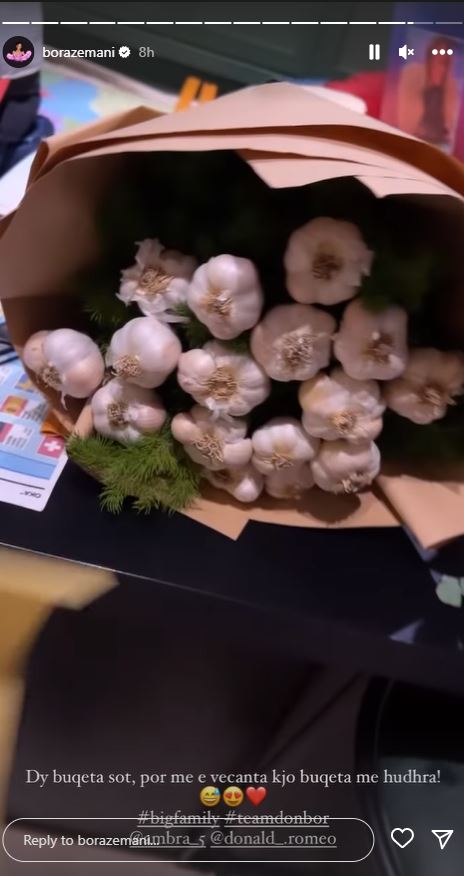 “Dy buqeta sot, por më e veçanta kjo buqeta me hudhra”, ka shkruar Bora përmbi postimin në ‘Instastory’.