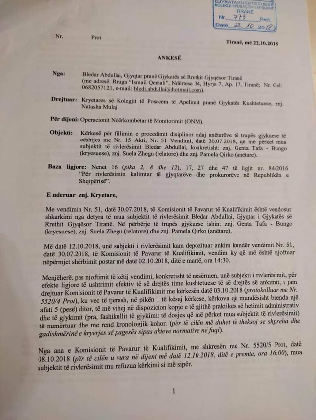 Në media ka qarkulluar një dokument nga KPK dhe ONM, ku në brendësi ka paragjykime krahinore dhe ky episod ka ndodhur në organin më të lartë të drejtësisë, në Vetting.