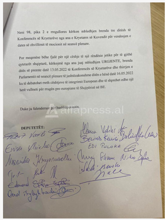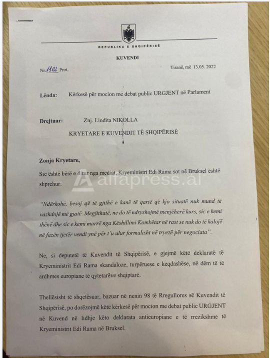 “Deputetet e opozitës kanë vendosur të paraqesin me urgjencë në parlament kërkesën për mocion me debat lidhur me kërcënimin që Rama bëri në Bruksel për ndryshimin e drejtimit nëse nuk hapen negociatat.