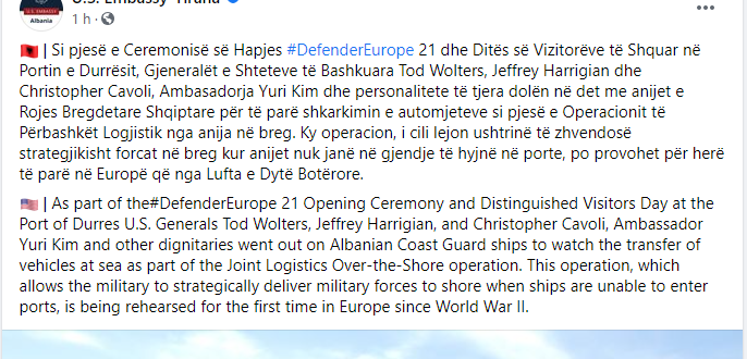 “Si pjesë e Ceremonisë së Hapjes #DefenderEurope 21 dhe Ditës së Vizitorëve të Shquar në Portin e Durrësit, Gjeneralët e Shteteve të Bashkuara Tod Wolters, Jeffrey Harrigian dhe Christopher Cavoli, Ambasadorja Yuri Kim dhe personalitete të tjera dolën në det me anijet e Rojes Bregdetare Shqiptare për të parë shkarkimin e automjeteve si pjesë e Operacionit të Përbashkët Logjistik nga anija në breg. Ky operacion, i cili lejon ushtrinë të zhvendosë strategjikisht forcat në breg kur anijet nuk janë në gjendje të hyjnë në porte, po provohet për herë të parë në Europë që nga Lufta e Dytë Botërore”,- thuhej në mesazhin në Fb të Ambasadës Amerikane në Tiranë.