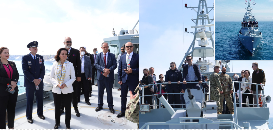 Fotot e shpërndara nga faqja zyrtare e Ambasadës së SHBA-ve në Tiranë, tregojnë se disa nga ministrat e qeverisë si Xhaçka, Peleshi, Balluku, bashkë me kryeministrin Edi Rama dhe me kryebashkiakun e Tiranës, Erion Veliaj, që kanë bërë një udhëtim të shkurtër me një anije ushtarake për të parë nga afër platformën lundruese të ngritur pranë Durrësit nga Marina Amerikane.