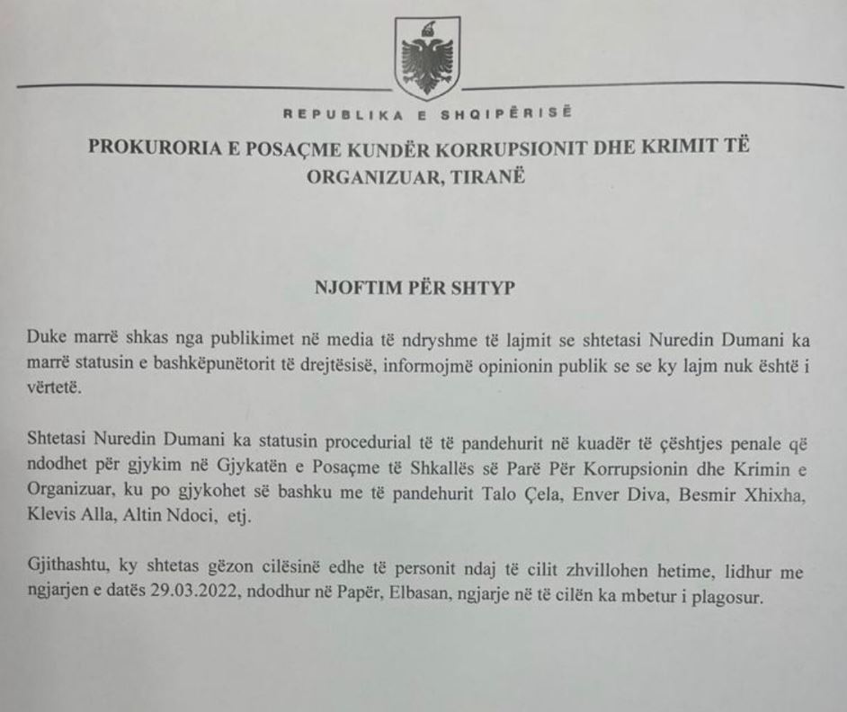 Nëpërmjet një njoftimi për shyp SPAK shkruan: “Duke marrë shkas nga publikimet në media të lajmit se Dumani ka marrë statusin e bashkëpunëtorit të drejtësisë, informojmë opinionin publik se ky lajm nuk është i vërtetë.”
